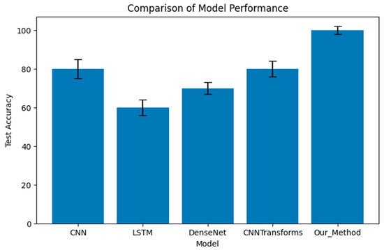 The comparison results of 10 experiments of different models are shown in Figure 11. It can be seen from the figure that the average test accuracy of the CNN model is close to 80%. The error bar shows that its accuracy has certain fluctuations. The average test accuracy of the LSTM model is about 60%, and the model does not perform well when dealing with the current task. The test accuracy of DenseNet model is slightly higher than that of LSTM, nearly 70%. The test accuracy of the CNN-Transformer model is significantly improved with an average accuracy of about 80% and small errors. This shows that the data enhancement strategy has a significant effect on the improvement of model performance. CRAMNet has the best performance, with an average test accuracy of nearly 100% and a small error range. Compared with other models, CRAMNet not only leads in average test accuracy, but also shows better robustness and stability, so it is more suitable for application in practical engineering.