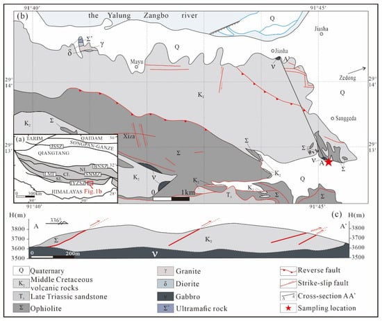 (a) Simplified tectonic map of the Tibetan Plateau (modified from [34]), showing the location of the Lhasa terrane and the study area. (b) Detailed geological map of the Zedong ophiolite at the eastern of the IYZSZ (modified from [35]). (c) Geological cross-section AA’ shows the contact relationships between the Sanggeda gabbros and the Middle Cretaceous volcanic rocks. Abbreviations are as followings: JSSZ = Jinshajiang Suture Zone, BNSZ = Bangong–Nujiang Suture Zone, SNMZ = Shiquan River–Nam Tso Mélange Zone, LMF = Luobadui–Milashan Fault, IYZSZ = Indus–Yarlung Zangbo Suture Zone, SL = southern Lhasa subterrane, CL = central Lhasa subterrane, and NL = northern Lhasa subterrane.