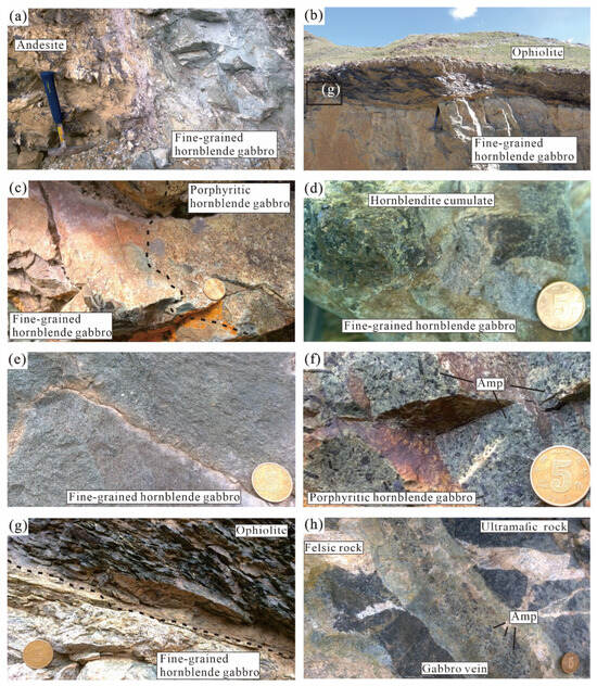 Field photographs of the Sanggeda rocks. (a) The intrusion is in fault contact with the andesite. (b) Gabbro intruded into the ophiolite, causing significant serpentinization and schistosity in the latter. (c) The contact boundary between fine-grained hornblende gabbro and porphyritic hornblende gabbro. (d) Hornblendite cumulate enclave within the fine-grained hornblende gabbro. (e) Fine-grained hornblende gabbro. (f) Porphyritic hornblende gabbro. (g) Detailed view of the contact boundary in (b). (h) Gabbro vein intruding into the ultramafic rock after the felsic rock. Dashed lines indicate the lithologic boundary. The diameter of the coin is 20.5 mm.