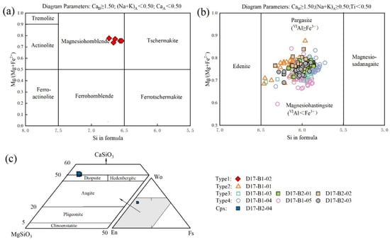 Mineral compositions of representative amphiboles and clinopyroxenes from the Sanggeda intrusion. (a,b) Classification of amphiboles according to the nomenclature of [45]. (c) Data for clinopyroxene from hornblendite cumulate enclaves plotted on the enstatite–ferrosilite–diopside–hedenbergite quadrilateral of [50]. Except for Type 1, hollow and solid symbols represent crystals dispersed in the matrix and cumulate enclaves, respectively.