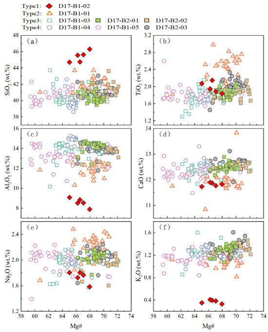 Representative amphibole analyses were plotted in bivariate diagrams against Mg# (Figure 6). The Mg# of the Type 1 amphibole (approximately 65–68) is at an intermediate level, with higher SiO2 and lower Al2O3 and K2O contents compared to other types of amphiboles. The Type 2 amphibole has higher TiO2 and Na2O contents, lower Al2O3, CaO, and K2O contents, and similar SiO2 contents. The Type 3 and 4 amphiboles show a wide Mg# range (about 59–72) but relatively similar major element compositions.