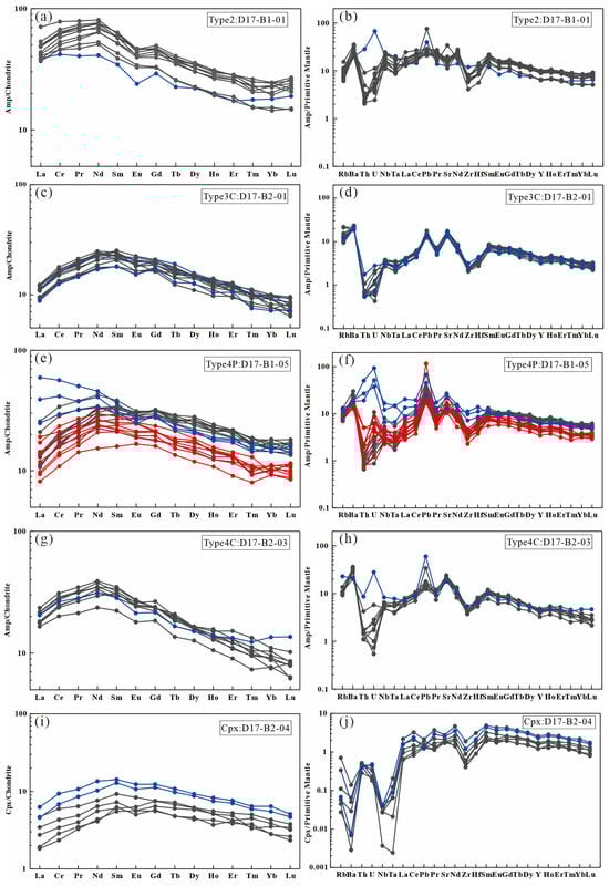 Chondrite-normalized REE patterns and primitive-mantle-normalized trace element patterns for amphiboles and clinopyroxene. Chondrite and primitive mantle values are from [51]. The compositions of the core, mantle, and rim are presented as grey, red, and blue lines, respectively.