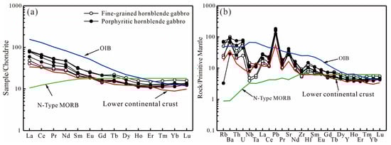The whole-rock study in Jing’s master thesis [42] is provided in Supplementary Table S5. The Sanggeda intrusion primarily consists of fine-grained hornblende gabbro and porphyritic hornblende gabbro. They formed contemporaneously, as indicated by the gradual transition between the two lithologies and the absence of chilled edges. These lithologies exhibit similar REE patterns to the lower continental crust [3,42] (Figure 8). The shallow-level emplacement and rapid cooling of magma resulted in the fine-grained and porphyritic textures of the intrusion. Precursory crystal populations can be easily distinguished from those crystalized from the host magma.