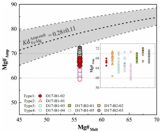 The amphibole crystal population plays a crucial role in the formation of the Sanggeda gabbros. The complex texture and composition of the amphiboles indicate that the intrusion is not the result of a single magma chamber undergoing continuous evolution. Equilibrium diagrams have been employed [52] to access the mineral-melt equilibrium between different amphibole types and the host magma. The Mg# of the amphiboles is plotted against the Mg# of the melt (calculated as molar ration: 100MgO/(MgO + FeO)). The curves, calculated based on the iron-magnesium exchange coefficient for amphibole ( = 0.28 ± 0.11) [53], represent the range where mineral and melt compositions are in equilibrium. All amphiboles plot below the curves (Figure 9), suggesting that they may not be in equilibrium with the melt.
