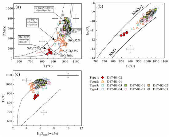 The results indicate that the amphiboles typically contain high water content in the melts (H2Omelt, 4.4–7.4 wt.%, Table 2). The crystallization conditions for the Type 1 amphibole are significantly different from other types (Figure 10). The crystallization temperature (T) of Type 1 ranges from 847 ± 22 °C to 881 ± 22 °C, the pressure (P) ranges from 93 MPa to 176 MPa, and the calculated continental depth is 3.5–6.7 km, with an average depth of 4.8 km, the shallowest among all amphibole types, consistent with the host magma’s shallow crustal intrusion. The oxygen fugacity (∆NNO) ranges from 1.0 to 1.3 log units above the nickel-nickel oxide (NNO) buffer, and H2Omelt values range from 5.1 to 5.6 wt.% (Table 2).