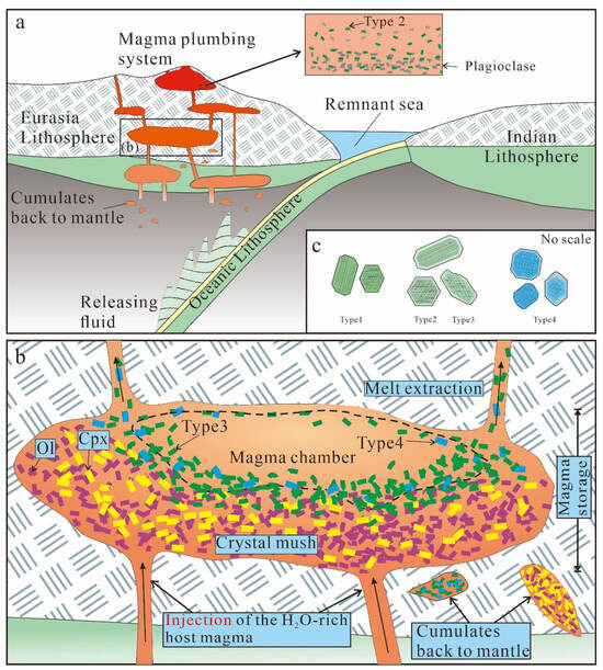 In the lower crustal magma chamber, olivine and pyroxene likely crystallize first from the primitive magma, with most accumulating and separating from the residual melt, leaving only a small fraction in the melt (Figure 11b). This fractional crystallization is beneficial for the formation of amphibole Types 3–4. Crystallization of anhydrous minerals progressively enriches water in the melt. This promotes the stability of clinopyroxene over orthopyroxene while suppressing plagioclase crystallization. The Type 3 amphibole will precipitate when the H2O-saturated magma encounters the amphibole stability curve [19], forming an idiomorphic morphology due to ample growth space, as mentioned earlier. The Type 4 amphibole forms via a rock-melt reaction, in which precursor clinopyroxene reacts with residual or injected melts. During this process, clinopyroxene is entirely consumed (Figure 5c,d).