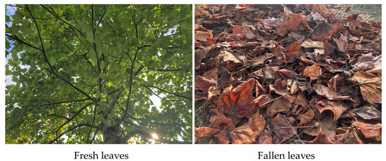 Liriodendron tulipifera L., belonging to the Magnoliaceae family, is a hardwood tree and grows to 25–40 m in height as well as to 1–2 m in trunk diameter. The alternate simple leaves are palmately lobed and grow up to 10–15 cm long and wide [1,2]. The species is native to eastern North America and was introduced to many other countries under temperate climate conditions in Europe and East Asia [3,4,5]. L. tulipifera grows along residential streets as shade trees and in parks as well as gardens as ornamental trees [6,7,8]. L. tulipifera is also valuable as a nectar source for honey production. A 20-year-old tree of L. tulipifera was recorded to produce 3.6 kg of nectar in one season, which is equivalent to 1.8 kg of honey [6]. Since L. tulipifera grows rapidly and has tall and straight trunks, its timber is commercially valuable [2,3,9]. The average dry weight of the timber is 455 kg per m3 (hardness, 2400 N) [9], and the wood of L. tulipifera is used in a wide range of products, such as furniture, interior finishing, and plywood [10,11,12]. However, logging operations of L. tulipifera from tree plantations create a great amount of industrial waste, such as leaves, branches, bark, and stumps. It was recorded that 80% of total tree biomass went to waste during logging operations [13]. Minimizing waste may contribute to the sustainability of timber production systems and reducing the environmental impact [14,15]. The development of possible applications for the waste from timber processing and the minimization of the environmental impact are two tasks to be completed for future timber production systems. Several options of the usage of L. tulipifera waste from logging operations have been investigated, such as charcoal and bio-oil from the wood waste [13,16], solid fuel from the sawdust [17], and bioethanol from the branches and wood [18,19]. In addition, L. tulipifera is a deciduous tree species, and its fallen leaves accumulate on the streets and grounds in parks and gardens in the autumn, where they are grown as shade and ornamental trees. These fallen leaves need to be organized at a high expense [20]. However, the utilization methods of leaf waste from logging operations and fallen leaves from residential areas have not yet been investigated.