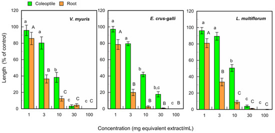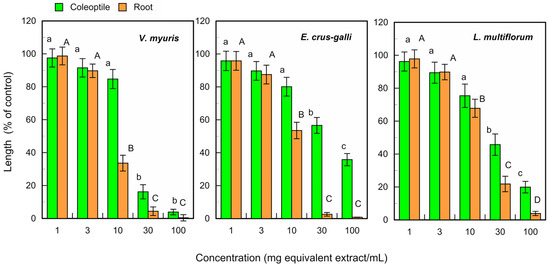 Effects of L. tulipifera fresh leaf extracts against the coleoptile and root growth of V. myuros, E. crus-galli, and L. multiflorum under laboratory conditions. The concentrations on the X-axis indicate the substances obtained from 1, 3, 10, 30, and 100 mg of L. tulipifera leaves in 1 mL of the assay solution. The means ± SE were calculated from four independent experiments with 10 seedlings for each determination. Different letters on the bars in the same panels indicate significant differences at a p < 0.05 level.