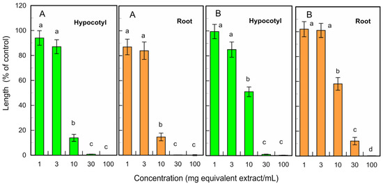 Effects of the fresh (A) and fallen (B) L. tulipifera leaf extracts against the growth of L. sativum hypocotyls and roots. Other conditions were the same as those described in Figure 3.
