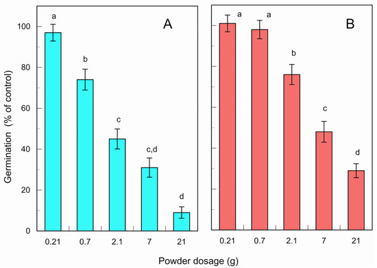 Effects of the fresh (A) and fallen (B) leaf powder of L. tulipifera against the germination of E. crus-galli under greenhouse conditions. The means ± SE were calculated from four independent experiments with 100 seeds for each determination. Different letters on the bars in the same panels indicate significant differences at a p < 0.05 level.