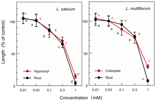 Effects of lipiferolide on the L. sativum hypocotyl and root growth, as well as on the L. multiflorum coleoptile and root growth. The means ± SE were calculated from four independent experiments with 10 seeds (L. sativum) and 10 germinated seeds (L. multiflorum) for each determination. Different letters on the bars in the same panels indicate significant differences at a p < 0.05 level.