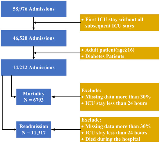 To ensure the comparability of our results with previous relevant studies, we adhered to identical patient selection criteria, avoiding analyses based on specific diseases. Instead, we integrated data from all patients, thereby enhancing the generalizability of our findings. This methodology enables us to contribute to the existing literature on predicting ICU mortality and readmission rates while maintaining consistency with prior research [24,25]. The objectives of this study were twofold: first, to predict patient mortality at 3, 30, and 365 days post discharge, and second, to predict ICU readmission within 30 days of discharge. A patient cohort was selected based on the following exclusion criteria: initially, the first ICU stay without all subsequent ICU stays; adult patients (age ≥ 16); and type 2 diabetes patients.