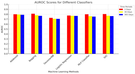 Table 3 presents the AUROC scores for various classifiers in mortality prediction. Notably, for the 3-day mortality prediction, the bagging classifier achieved the highest AUROC score of 0.8112, surpassing other methods. In contrast, for the 30-day and 365-day mortality predictions, the Adaboost classifier obtained the highest AUROC scores of 0.7952 and 0.7898, respectively. This highlights Adaboost’s superior capability in distinguishing between patients who were readmitted and those who were not. Figure 3 depicts the ROC curves of the classifiers, visually illustrating their trade-offs between true positive and false positive rates. These curves effectively demonstrate the performance of each classifier across different thresholds. In the figure, the red dashed line represents the baseline for a random classifier, corresponding to an AUROC of 0.5. Figure 4 compares the AUROC scores for different machine learning methods across 3 days, 30 days, and 365 days, providing a clear visualization of their relative effectiveness.