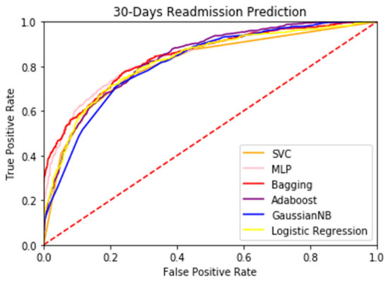 As with the mortality prediction, a 10-fold cross-validation approach was used to develop a prediction model for 30-day readmission rates in patients with type 2 diabetes. The model integrated data collected during the patient’s last 24 h before discharge and the corresponding treatment plan provided by the attending physician. The dataset was divided into training (80%) and testing (20%) subsets, and rigorous statistical analysis was performed to evaluate the performance of the model. The results summarized in Table 5 and shown in Figure 5 show the AUROC scores and ROC curves for various classifiers.