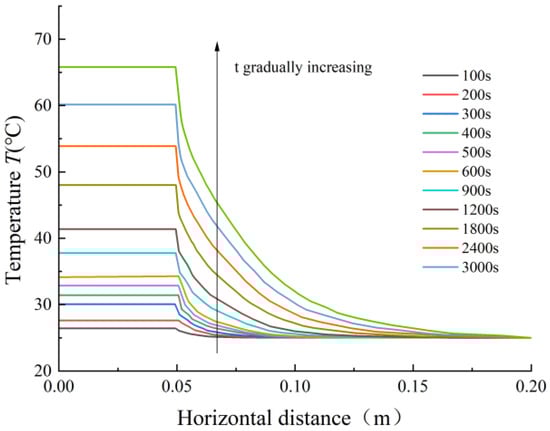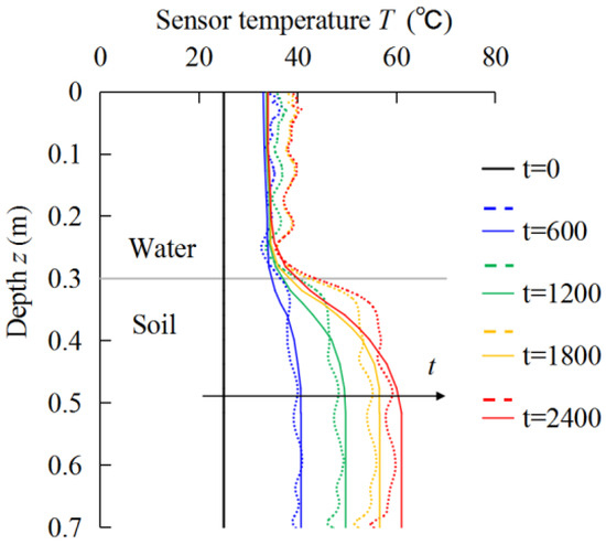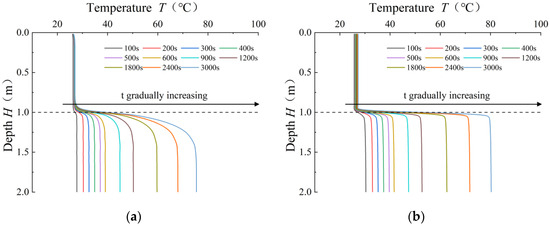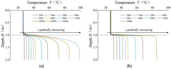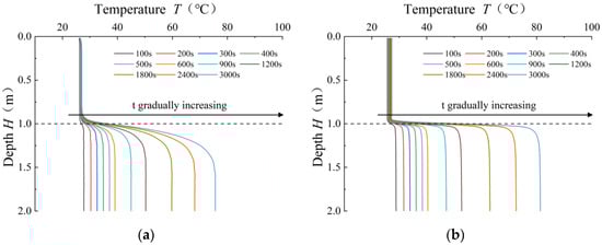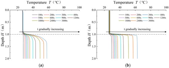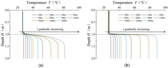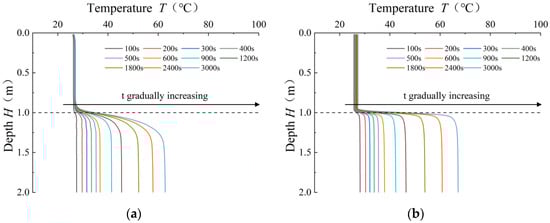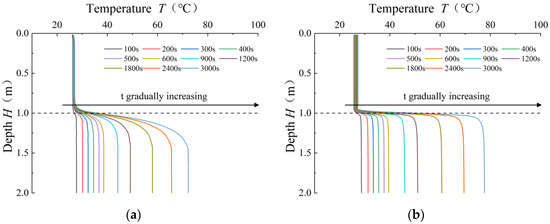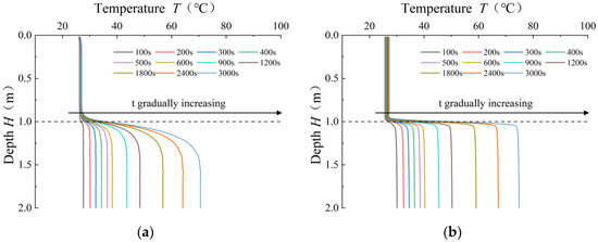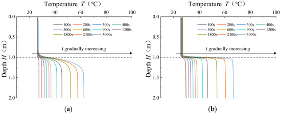 - The temperature increase patterns of iron-based linear heat sources and PVC-based linear heat sources were calculated in eight types of cohesive soils and six types of non-cohesive soils. It was observed that there were significant differences in temperature distribution between the iron-based and PVC-based linear heat sources in both seawater and cohesive soils. Specifically, a notable temperature gradient was present at the interface between water and soil, and this gradient became increasingly pronounced with time. This phenomenon could be attributed to the fact that, when the linear heat source was situated within the soil medium, the low thermal diffusivity of the soil resulted in a slower rate of temperature increase on the surface of the linear heat source. Conversely, when the linear heat source was submerged in the water medium, the efficient thermal diffusion properties of water led to a rapid increase in surface temperature. Consequently, by monitoring the changes in the surface temperature of the heat source, the temperature trends in different media could be analyzed, allowing for the identification of the water–soil interface within cohesive soils.