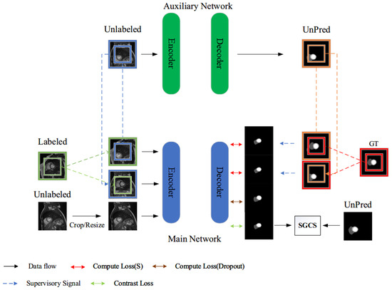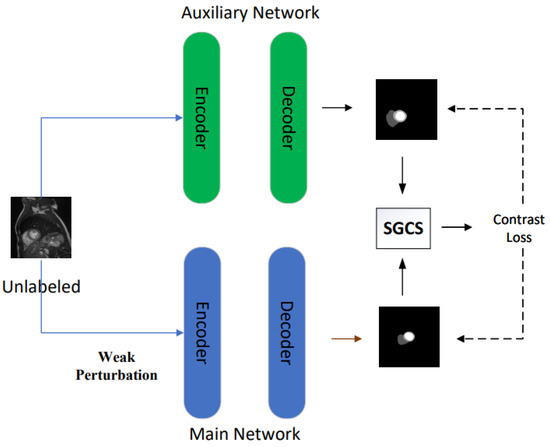 The principal advantage of semi-supervised learning (SSL) is that a substantial amount of unlabeled data can be utilized to enhance the efficacy of the model during training. The main challenge resides in designing effective supervised signals for unlabeled data. Recently, there has been a surge in research on semi-supervised medical image segmentation [19]. Two primary loss functions proposed to tackle this issue are entropy minimization [20,21,22] and consistency regularization [23]. The fundamental concept of entropy minimization involves assigning pseudo-labels to unlabeled data, which are then combined with manually labeled data for retraining. The core principle of consistency regularization posits that images subjected to data perturbation and geometric transformations should maintain unchanged outputs, ensuring consistent predictions.