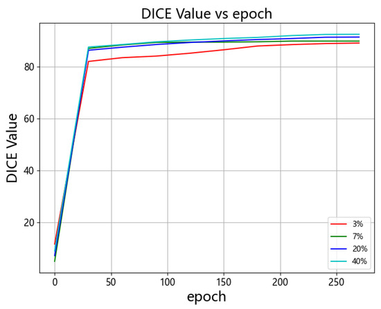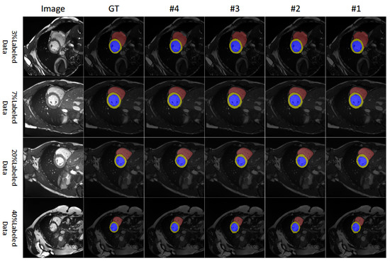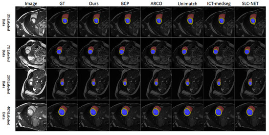The ACDC dataset [34] is a publicly available dataset containing cardiac MRI images from 100 patients. Each patient’s data include two-dimensional image sequences capturing the entire cardiac cycle at end-systole (ES) and end-diastole (ED). Each image sequence includes three segmentation targets: the right ventricle (RV), the left ventricle (LV), and the myocardium (MYO). The dataset was selected due to its prevalence in cardiac image segmentation studies, thus facilitating comparisons with other methods. To assess the efficacy of semi-supervised training, we employed the segmentation of three-dimensional volumetric images into two-dimensional slices. The training process was conducted on an NVIDIA Tesla V100 GPU. We used a crop size of 256 × 256 and a batch size of 8 per GPU. The model was trained for 300 epochs using a learning rate of 0.01 with an SGD optimizer. The optimizer had a momentum of 0.9 and a weight decay of 0.0001. A confidence threshold of 0.95 was applied during training to filter out uncertain predictions.
