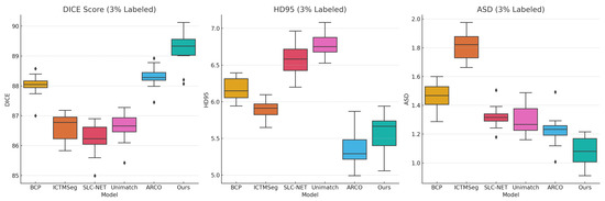 Box plots of DICE, HD95, and ASD for different models at 3% labelling rate.
