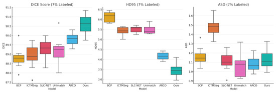 Box plots of DICE, HD95, and ASD for different models at 7% labeling rate.