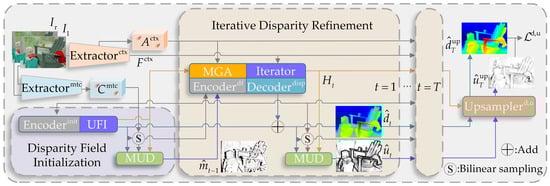 During initialization, the initial disparity field’s hidden state and disparity are obtained through the simplified disparity field feature encoder and the in the UFI module (see Section 3.2.1). In each iteration, the matchability mask is decoded by the MUD module from the hidden state (see Section 3.1.1). Next, the is fed to the disparity field feature and MGA modules to filter out the matching ambiguity noise and the unreliable hidden state (see Section 3.2.2), respectively. The hidden state updated by the is fed to the residual to refine the estimated disparity: . The and are then utilized by the MUD to decode the next mask and uncertainty . At the end of each iteration, the , and can optionally be fed to the joint upsampling block to obtain the upsampled disparity and uncertainty . The proposed iterative disparity refinement is completed after iterations of the above process.