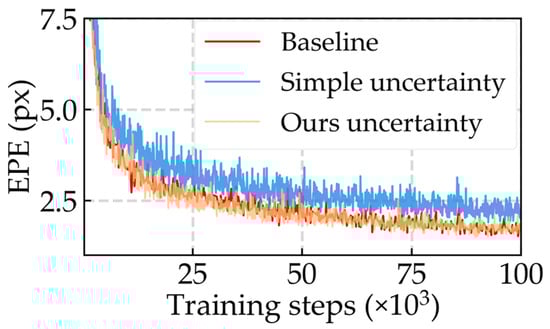 where is a weighting parameter (usually set to 0.9). Preliminary experiments are performed by adding the uncertainty prediction network to the baseline as the loss function replaced by Equation (6). The endpoint error (EPE) curves in Figure 4 show the decrease in disparity accuracy due to the simple design of the joint training.