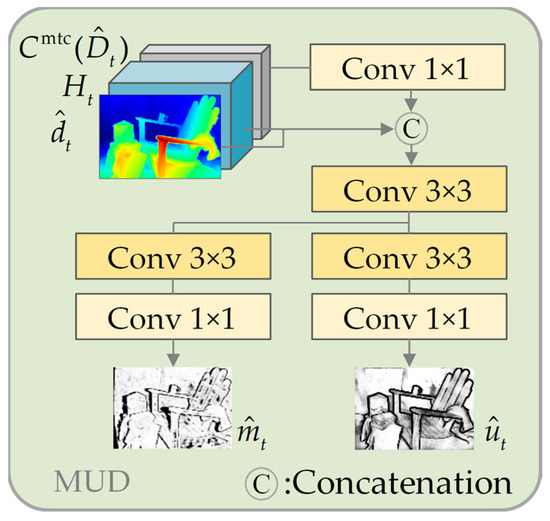 where denotes a simple convolutional network with parameter . In addition, to keep the pixel-wise correspondence between disparity and uncertainty after upsampling, the and are computed together via the joint disparity–uncertainty upsampler. It is shown in Figure 4 that the proposed method greatly alleviates the decrease in disparity accuracy introduced by the joint training.