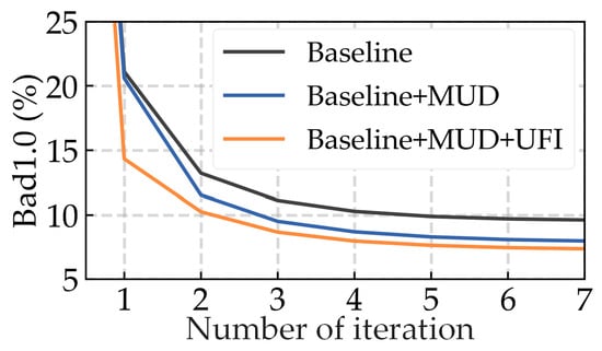 The MUD module is proposed in Section 3.1 and is designed to reduce the susceptibility to mismatched pixels. The matchability mask and disparity uncertainty of each iteration can be decoded from the hidden state using the MUD. In row 3 of Table 1, the modified joint disparity–uncertainty estimation proposed in Section 3.1.2 is evaluated. Compared to the original method [17] (row 2), our method reduces the disparity EPE by about 15.4% and the uncertainty APE by 41.2%. It alleviates the unnecessary decrease in disparity accuracy during joint training. Following this, in rows 4 and 9 of Table 1, the MUD module is evaluated. Compared to the uncertainty-aware only method (row 3), the disparity EPE and uncertainty APE is reduced by about 12.5% and 11.3%, respectively. Compared to the baseline (row 1, 8), the EPE and Bad1.0 Occ are reduced by about 8% and 10.9%, respectively. This demonstrates the improved robustness in ill-posed regions.