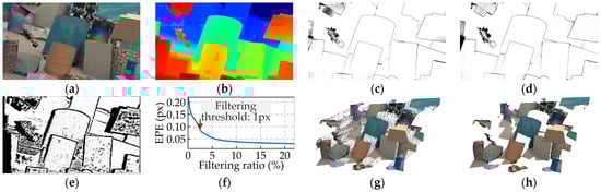 Illustration of the output of the MUIR and the alternative output filtering. (a) The input left image; (b) the estimated disparity map; (c) the disparity error map; (d) the error map converted from the estimated uncertainty; (e) the estimated matchability mask; (f) the error-filtering ratio curve (the original EPE is 0.223 px); (g,h) the point cloud converted from the estimated disparity map w/o filtering (g) and with filtering threshold set to 1 px (h). The results are best viewed when zoomed in.