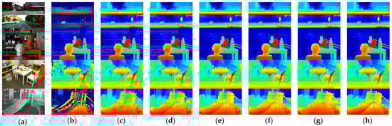 - Scharstein, D.; Hirschmüller, H.; Kitajima, Y.; Krathwohl, G.; Nešić, N.; Wang, X.; Westling, P. High-Resolution Stereo Datasets with Subpixel-Accurate Ground Truth. In Pattern Recognition; Jiang, X., Hornegger, J., Koch, R., Eds.; Lecture Notes in Computer Science; Springer International Publishing: Cham, Switzerland, 2014; Volume 8753, pp. 31–42. ISBN 978-3-319-11751-5. [Google Scholar]