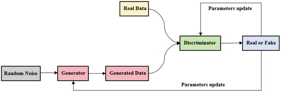 GAN is a framework proposed by Goodfellow in 2014 and consists of two simultaneously trained networks: the generator and the discriminator (Figure 1) [12]. The generator generates spurious samples using the provided noise variables as input. The discriminator is responsible for distinguishing whether the input samples are real or fake. The goal of the generator is to produce real samples, while the goal of the discriminator is to specifically distinguish between real and fake samples. The competition between the generator and the discriminator makes the two models equivalent to optimizing the training process until an equilibrium state is reached. The loss function in GAN is defined as follows: