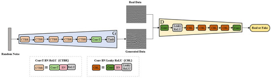 DCGAN was proposed by Alec Radford in 2015, and the changes made compared to the original GAN are as follows: (1) no pooling layer is used, and the fully connected layers in the generator and discriminator in the original GAN are replaced with convolution and transposed convolution layers; (2) batch normalization is used in each layer of the generator and discriminator; (3) the generator’s output layers using the Tanh activation function, and the other output layers using the rectified linear unit (ReLU) activation function; and (4) the leaky rectified linear unit (LeakyReLU) activation function is used on all layers of the discriminator [19]. These changes improve the stability of the GAN and the quality of the generated results. The network structure of the DCGAN used in the paper is shown in Figure 2.