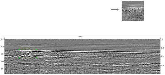 The measured GPR images are obtained by using a vehicle-mounted MALA GX750 model GPR instrument with a center frequency of 750 MHz, manufactured by the Swedish company GuidelineGEO, Stockholm, Sweden, acquired on a highway in China with the acquisition vehicle at a speed of 55 km/h, and are coupled with air coupling. Then, the processed images are labeled with the open-source dataset annotation tool, labelImg, to label the structural loose distresses, and a sample dataset is produced. Finally, 624 GPR images containing structural loose distresses are obtained. One image may contain multiple distresses, so a total of 670 structural loose distresses are contained in the 624 images.