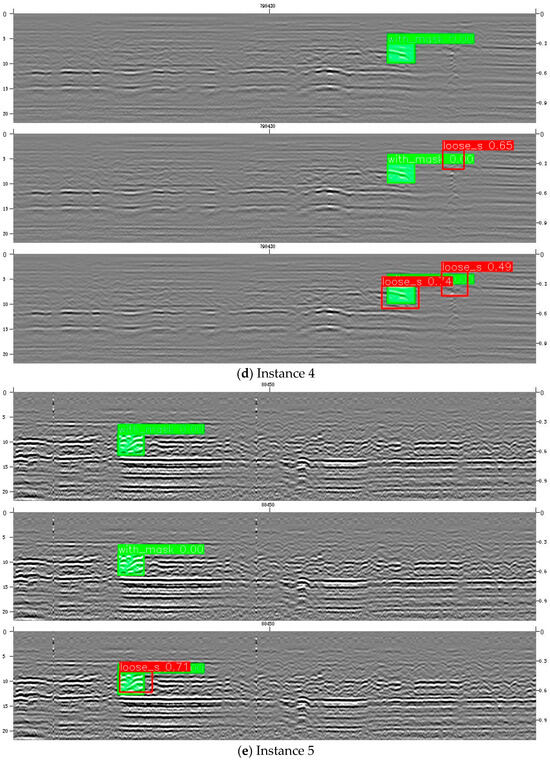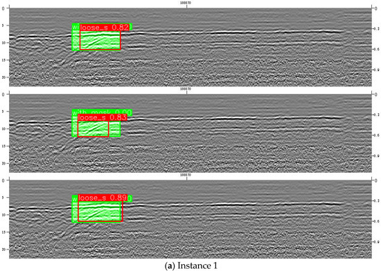 Figure 12 shows the visualization of the results after the detection of the test set. In terms of detection accuracy, it can be seen from the comparative effects in Figure 12a–e that the detection accuracy of the model trained on the dataset after data augmentation is improved, and then additionally, the detection accuracy is improved even more significantly after combining SAHI in the training and inference stages. In terms of the leakage situation, it can be seen from Figure 12b,d,e that the model trained on dataset I fails to recognize the structural loose distresses, and in Figure 12b, the model trained on the dataset after data augmentation can recognize the distress, but with lower accuracy, and cannot recognize the loose structure distress in Figure 12d,e. Whereas, after combining the SAHI framework in both the training and inference stages, it can recognize all the loose structure distresses that were missed, and all of them have higher accuracies of more than 70%, which greatly reduces the missed detection rate. As can be seen in Figure 12c,d, after using SAHI in the training and inference stages, some false detections occur, mainly because the feature expression of non-targets that are similar to the target features after image slicing is also enhanced, but from the point of view of the improvement of detection accuracy and the reduction of the leakage detections, the use of the image-expanded dataset generated by DCGAN and the use of SAHI in the training and inference stages can significantly improve the detection effect. Especially, the missed detection is greatly reduced after using SAHI.