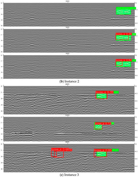 Figure 12. Visualization of the detection results on the test set. (In each sub-figure, top: detection results on the test set of the model trained using dataset I, middle: detection results on the test set of the model trained using dataset II, bottom: detection results on the test set of the model trained using dataset IV and after SAHI was used in the inference stage, where the green part represents the real label box).