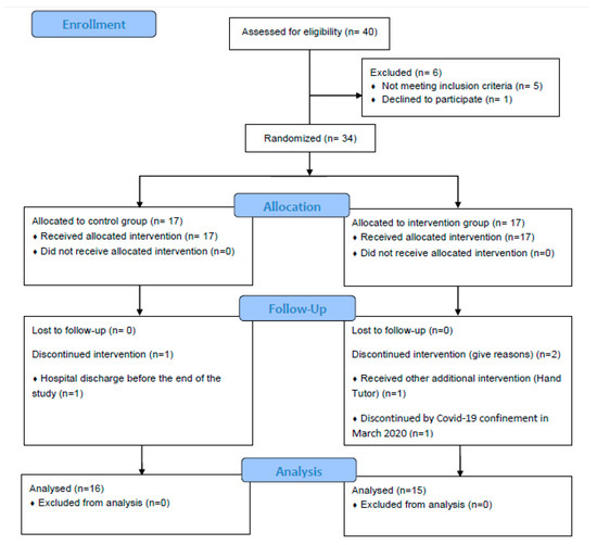 Of the 34 subjects enrolled in this study, 3 dropped out of the study before completing the established treatment. One received UE treatment by means of another device (Hand Tutor), the second subject was discharged from the hospital before the end of the treatment, and the third subject’s treatment was interrupted by confinement due to COVID-19 in March 2020. The demographic and functional characteristics of the 31 participants are shown in Table 1, showing the homogeneity of both groups at baseline condition. Therefore, both groups were matched with respect to their cervical metameric level and the severity of injuries suffering the subjects.