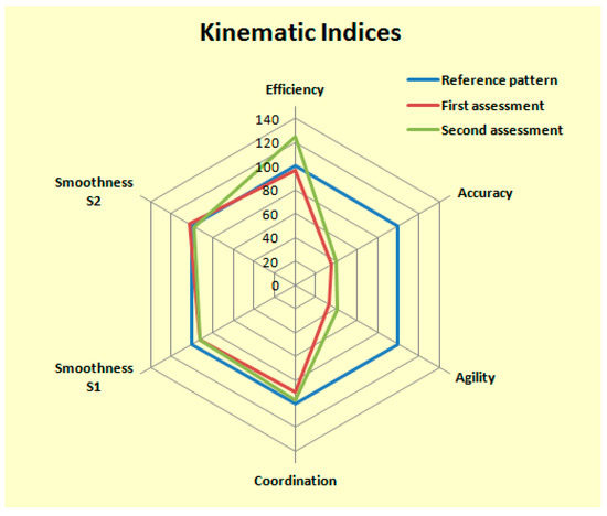 - Kinematic indices related for the ADL of drinking from a glass. Several kinematic indices were computed for characterizing the UL movement pattern during the performance of the drinking task in a real environment. Following the experimental protocol described in our previous study, the subjects were instrumented with the active markers of the photogrammetry system Codamotion (Charnwood Dynamics, Ltd., Rothley, UK) for measuring their UE kinematics during the performance of the drinking task in a real environment [35]. For each participant, this assessment was unilateral over the treated UL chosen in the context of this clinical study, analyzing the movement of the trunk, arm, forearm, and hand body segments. Then, the kinematic indices of accuracy, efficiency, agility, coordination, and smoothness were computed as measures of UE ability and dexterity [36,37]. Thus, accuracy and efficiency indices were computed from the hand trajectory during the movement; agility and smoothness indices from the analysis of the hand velocity profile; and coordination index from the joint kinematic data of the shoulder and elbow. The results related to the kinematic indices could be graphically expressed for each participant (Figure 3).