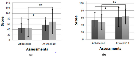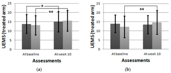 (a) Upper extremity motor score (UEMS) of the upper limb treated for both groups when the total sample is analyzed (control group (n = 16) and intervention group (n = 15)); (b) upper extremity motor score (UEMS) of the upper limb treated for both groups when the treated arm was the dominant arm (control group (n = 12) and intervention group (n = 9)). Dark grey represented the control group. * p < 0.05, ** p < 0.01.