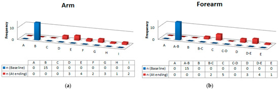 Finally, it is of special interest to show, as another outcome measure, the evolution that the subjects experienced in the gravity-compensation levels of the arm and forearm levers of the Armeo Spring. Depending on the progression and evolution of each subject, according to the clinical criteria of the therapist, these levels were modified until reaching a normal situation in terms of gravity (‘E’ for the arm and ‘C’ for the forearm) and even adding resistance, gradually up to a maximum of ‘I’ and ‘E’ in both levers (Figure 6). Only one subject reached these maximum levels during the treatment.
