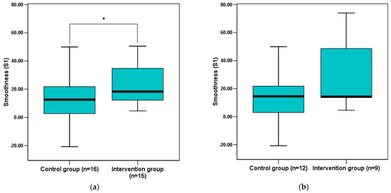 Inter-group comparison for the smoothness kinematic index for both groups: (a) when the total sample is analyzed; (b) when the treated arm was the dominant arm. The asterisks show the statistical significance (* p < 0.05).