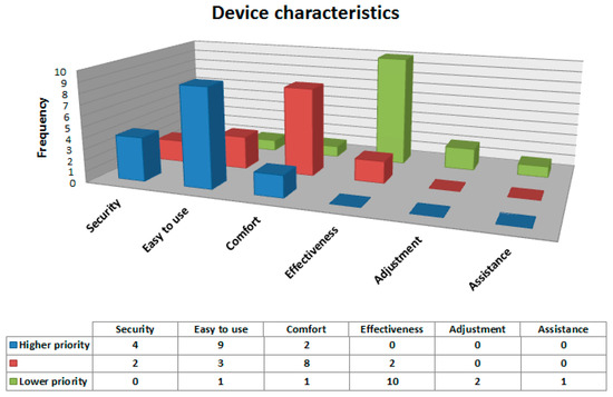 In Figure 8, the QUEST questionnaire results are shown, analyzing the three aspects that subjects considered more important, ordered by priority. Thus, the feature of the device that the subjects considered to be the most important was being easy to use, as rated by 9 subjects (60% of the sample comprising the intervention group). This was followed by the comfort of the device, a characteristic rated by 8 subjects (53.33% of the sample), and the third was effectiveness, rated by 10 subjects (66.66% of the sample).