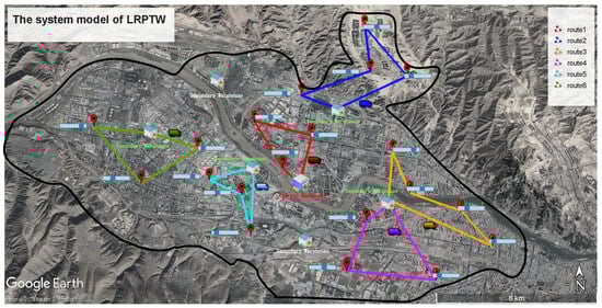 The LRPTW model presents a relatively complex problem space due to variations in solution models. Deep reinforcement learning can elucidate the structural characteristics of the LRPTW model by constructing a probabilistic model, which is implicitly utilized during the training process. These algorithms autonomously search the potential problem space and have proven effective in function optimization and combinatorial optimization challenges, including the hybrid flow shop scheduling problem (HFSP) [] and the Boolean satisfiability problem (SAT) []. Given their practical research value across various domains, this paper employs a deep reinforcement learning algorithm framework combined with the actual LRPTW model to tackle the real cold chain distribution problem of fresh agricultural products. The LRPTW reality model is depicted in Figure 1, which uses Google Satellite Maps as its source.