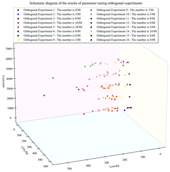 Each set of experiments was trained for 5000 s, and the 16 sets of training results were combined into a collection. Obtain a set of optimal non-dominated solutions through non-dominated algorithms. A total of 88 non-dominated solutions were obtained, with the largest proportion being 38 in Orthogonal Experiment 5. The Pareto front of this solution set is shown in Figure 4. Therefore, the algorithm hyperparameters are set to  equals 0.01 and  equals 0.95, respectively.