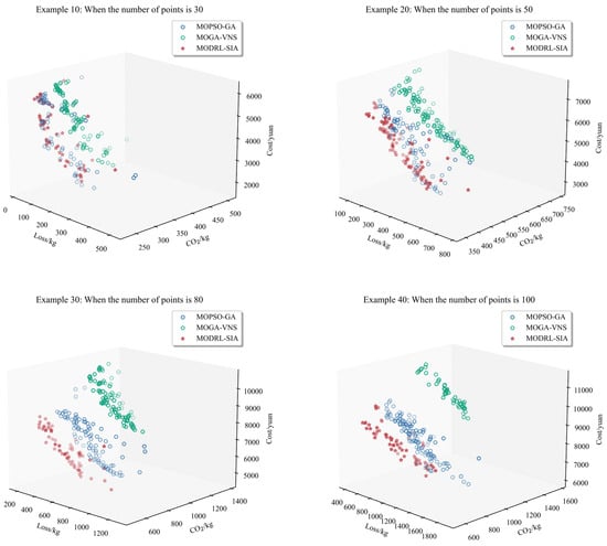 This paper has designed a total of four scale scenarios, including small-scale retail models, medium-scale town models, large-scale regional clusters, and extra-large-scale urban models. Each scenario consists of 10 variants, with each variant being run 10 times. The termination condition for the experiments is time-controlled, ensuring that each test is uniformly evaluated under similar temporal constraints. The termination condition during the experiment was set to reaching the predetermined running time. Verify the performance of the proposed MODRL-SIA framework algorithm in solving LRPTW. Customer points are randomly distributed on a 100×100 km map, and the central warehouse coordinates are (50, 50). Optional auxiliary warehouses are distributed at (25, 25), (75, 75), (25, 75), and (75, 25) with a construction cost of 1000 yuan each. The size of customer points is divided into small-scale (30 customer points), medium-scale (50 customer points), large-scale (80 customer points), and ultra-large (100 customer points). The number of central warehouses is set to one, and the number of optional auxiliary warehouses is set to four. The time window length of the customer point is set to 100 min, and the start time of the time window of the customer point is set to a random number between 0 and 1340. The demand at the customer point is set to a random number between 1 and 100 kg, the unloading time at the customer point is set to 30 min, and the time window of the warehouse is set to 0–1440 min. Taking a 4.2 m refrigerated truck as an example, fuel consumption is 15 L per 100 km, the gasoline cost is 8 yuan per L, refrigeration emits 0.2 kg of  per hour, and gasoline combustion emits 2.254 kg of  per liter. The vehicle traveling speed is 0.83 km/min, the vehicle fuel cost is 1.2 yuan/km, and the vehicle fixed cost is 100 yuan. The maximum load capacity of the vehicle is 1000 kg, and the maximum driving distance of the vehicle is set to 1000 km. Transportation losses occur when a single vehicle trip is greater than 100 km, at 5% when less than 200 km, 10% when less than 300 km, 15% when less than 400 km, 20% when less than 500 km, and 30% when more than 500 km. According to the commonly used means of transport and their properties in reality, the details of test examples are shown in Table 2.