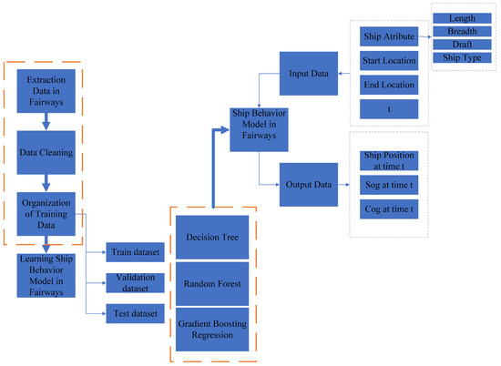 When training the Decision Tree model, we adjusted the max_depth, min_samples_split, and min_samples_leaf parameters to effectively control the model’s complexity and prevent overfitting, thereby enhancing the model’s generalization ability on unseen data. Additionally, we employed cross-validation to evaluate various parameter configurations, ensuring that the model maintains stable performance across different subsets. In training the Random Forest model, in addition to adjusting the basic parameters of the Decision Tree, we also optimized the n_estimators parameter, which determines the number of trees in the model. Increasing the number of trees helps improve the model’s stability and accuracy. We also used cross-validation techniques to find the optimal parameter combination, ensuring that the Random Forest model performs well under various data conditions. For the Gradient Boosting Regression model, we adjusted the learning_rate, n_estimators, min_samples_split, min_samples_leaf, and max_depth parameters. The learning_rate parameter controls the influence of each tree on the final prediction, with a lower learning rate potentially requiring more trees to fine-tune the model. By gradually experimenting with different numbers of trees and learning rates, we aimed to find the optimal model configuration to accurately predict vessel behavior within the channel.The framework of shhip behavior model in fairway as show in Figure 6.