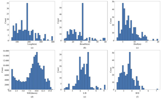 The distribution of data regarding ship length, width, draft, speed, length-to-width ratio, and width-to-draft ratio is shown in Figure 8. The distribution of ship lengths ranges between 40 and 260 m, with the highest frequency observed around 170 m. Ship widths are primarily between 12 and 34 m, with the most common width being approximately 33 m. Draft range from 2 to 15 m, with the most frequent around 5 m. The SOG displays multiple peaks, particularly between 7.5 and 12.5 knots. The length-to-breadth ratio (L/B) predominantly falls between 5 and 8, peaking around 6 and 7. The breadth-to-draft ratio (B/D) shows a broad distribution, with a notable peak around 4, indicating that most vessels have a width roughly 4 times their draft depth.
