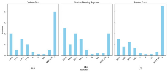 Feature importance plays a critical role in machine learning, aiding in understanding the decision-making process of models, enhancing model performance, and enabling feature selection. In this section, we compare the feature importance across Decision Tree, Gradient Boosting Regressor, and Random Forest models to evaluate the contribution of each feature to the models. The training data includes nine features: initial position longitude, initial position latitude, berth longitude, berth latitude, ship length, ship width, ship draft, ship type, and time. Figure 10 illustrates the feature importance for the Decision Tree model, Gradient Boosting Regressor, and Random Forest model.