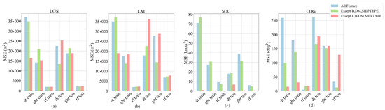 Figure 11 and Figure 12 compare the performance in terms of Mean Squared Error (MSE) and adjusted under three scenarios: retaining all features, removing vessel width, draft, and ship type, and removing vessel length, width, draft, and ship type.