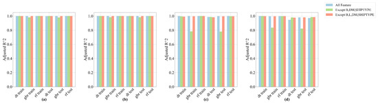 Figure 12 shows the adjusted values of the Decision Tree Regressor, Gradient Boosting Regressor, and Random Forest Regressor on the four prediction tasks (LON, LAT, SOG, COG), comparing their performance on the training and testing datasets. The figure compares three feature sets: including all features (All Features), excluding specific features (Except B, DM, SHIPTYPE), and excluding a broader set of features (Except B, L, DM, SHIPTYPE). In the Decision Tree model, the adjusted values show almost no difference across the three feature sets, indicating that these features have minimal impact on the model’s performance. In the Gradient Boosting Regression model, the adjusted on the test set slightly decreases after removing B, DM, and SHIPTYPE features, but it improves when L is also removed, still showing good fit quality. For the Random Forest model, the adjusted increases after removing some features, suggesting that excluding these features might help improve the model’s performance. Overall, the performance of all models remains relatively stable across different feature sets, with the exclusion of specific features having a minor impact on the models’ fit quality. The Random Forest Regressor, in particular, demonstrates better fitting performance after certain features are excluded.