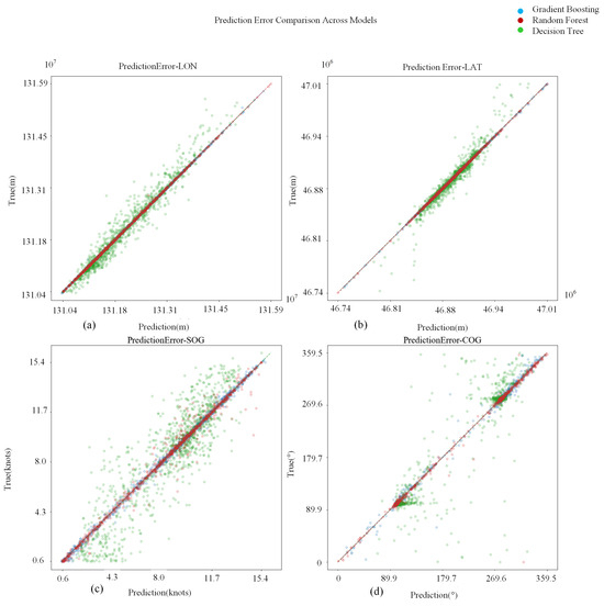 The prediction error plots demonstrate that the Random Forest model exhibits a strong linear relationship when handling the data, providing accurate predictions for longitude and latitude. Although some deviations are observed in the predictions for Speed Over Ground (SOG) and Course Over Ground (COG), the overall prediction accuracy of the Random Forest model surpasses that of the other models. Overall, the Random Forest model displays the best predictive performance. The Decision Tree model’s prediction results, as seen in the scatter plots, exhibit more dispersed points, indicating that its predictions are less accurate than expected. Compared to the Random Forest and Gradient Boosting Regressor models, the Decision Tree model performs poorly when handling this data. The Gradient Boosting Regressor model shows exceptionally high accuracy in predicting target variables LON and LAT, with predicted values closely aligning with actual values, indicating excellent predictive performance. In predicting SOG, although there are some points that deviate from the ideal red prediction line, the overall error remains small, demonstrating the model’s stability and accuracy in this dimension. However, in predicting COG, the points in the scatter plot are more dispersed, indicating a certain degree of prediction error. The Mean Squared Error (MSE) and Adjusted are used to quantify the prediction errors of different models, as shown in Table 2. Despite the favorable performance of both the Decision Tree and Random Forest models on the learning curves, the Decision Tree model suffers from overfitting and single-model limitations, resulting in poorer performance when predicting new data. In contrast, the Random Forest model, by integrating multiple decision trees, effectively reduces the risk of overfitting, enhancing the model’s stability and prediction accuracy.