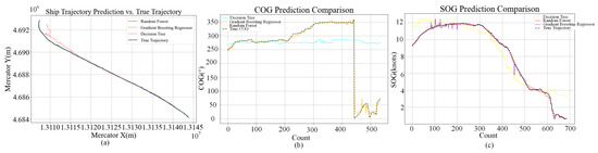Predictions for the Bulk Carrier (Length 199 m, Beam 32 m, Draft 13.1 m): (a) Position Prediction; (b) COG Prediction; (c) SOG Prediction.